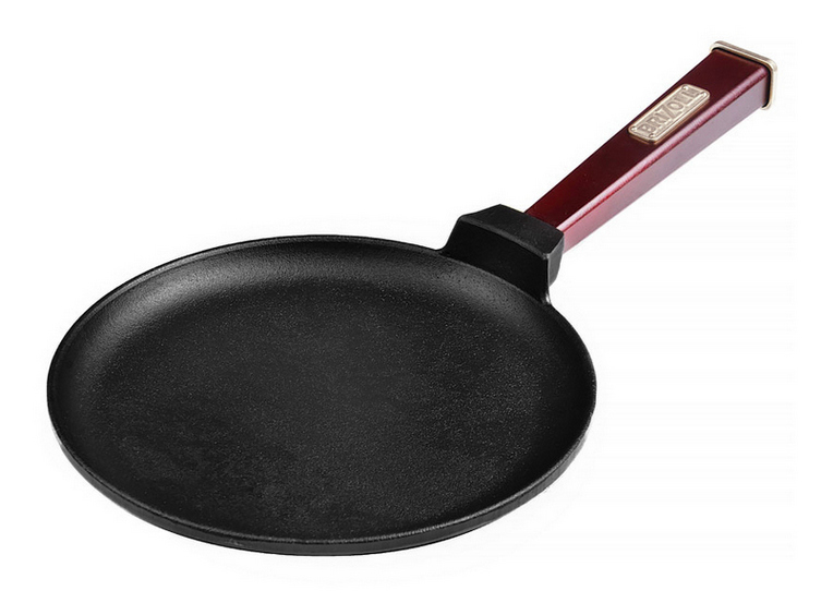 Сковорода для блинов изготовлена из литого чугуна, ручка выполнена из ольхи, имеет эргономичную форму и удобно лежит в руке. В ассортименте сковорода представлена в диаметре 220 и 240 мм. Низкая высота стенок, 15 мм, обеспечивает комфорт в приготовлении блинов. Поверхность износостойкая и пригодна для использования металлических лопаток, ложек и т. д. Перед первым использованием чугунной посуды ее нужно подготовить, чтобы очистить от технического масла, которым производитель защищает посуду от попадания влаги в поры чугуна и дальнейшего ржавления.