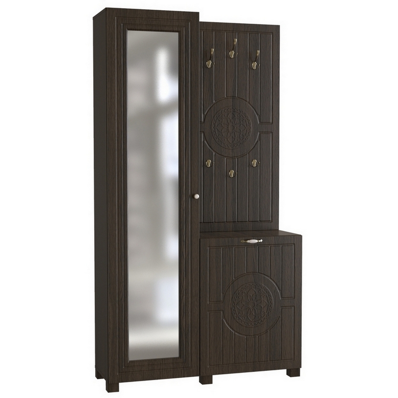 Готовое решение для прихожей. Вешалка, тумба для обуви, шкаф и зеркало. Стильная, функциональная и удобная мебель, оформленная в классическом стиле. Ценители эстетики оценят ее изысканность. Мебель из коллекции Bourbon обязательно заметят любители классики. Если Ваша цель — создать интерьер с характером, этот вариант именно для Вас. Изящный симметричный узор выгодно расставляет акценты. Изысканная и примечательная фурнитура ненавязчиво привлекает внимание. А качественные материалы обеспечивают длительную и комфортную эксплуатацию. Широкий модельный ряд позволяет удовлетворить любые потребности.