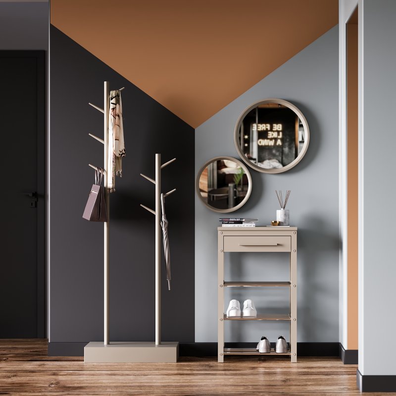 Прихожая доступна в палитре красочных цветов. Базовые тона – тёплые и тёмные оттенки – визуально расширяют или приближают поверхности. Яркие и сочные цвета – для тех, кто не боится экспериментировать.