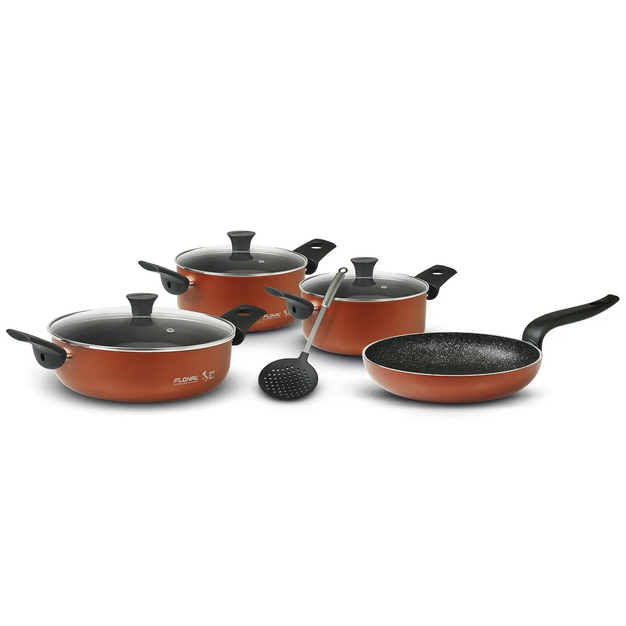 Логотип производителя с контурами Италии и надписью Made in Italy, нанесенный на корпус посуды шелкотрафаретным методом, также придает оригинальный оттенок элегантности. Нижняя часть посуды имеет рифленое антискользящее покрытие, что делает приготовление более безопасным. Бакелитовые ручки не нагреваются во время приготовления.
