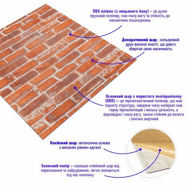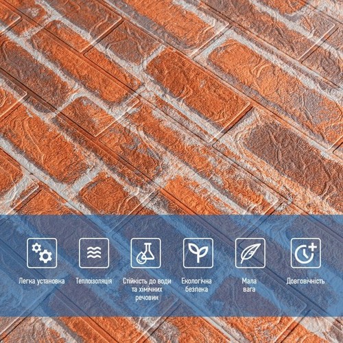 Декоративные 3D панели на самоклеющейся основе под рыжий Екатеринославский кирпич. Теперь можно с легкостью сделать ремонт за 1 день! При этом не нужно искать подрядчиков для ремонта, нет пыли и строительного мусора в доме. Материал - вспененный полипропилен. Срок службы составляет более 20 лет. Преимущества панелей: Легкий монтаж;