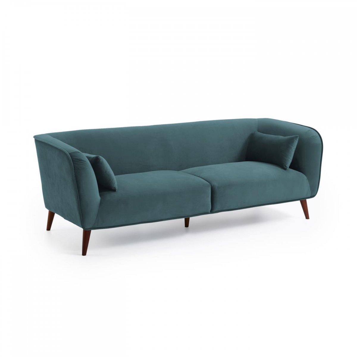 Эргономичной формы спинка, мягкое сиденье и изящные подлокотники обиты износоустойчивой, приятной на ощупь велюровой тканью. Диван декорирован подушками, подушки входят в комплектацию.