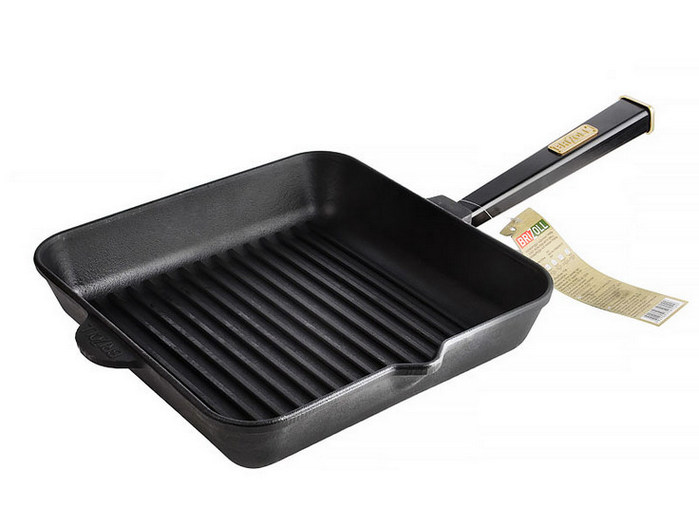 Сковородка-гриль – незаменимый помощник в приготовлении сочных мясных стейков, овощей гриль, колбасок с хрустящей корочкой и т.д. Именно благодаря своей уникальной форме блюда, приготовленные в чугунной сковороде гриль, выходят очень вкусными! Специальное рифленое дно способствует образованию хрустящей корочки, оставляя блюдо сочным внутри. Ничего не подгорает, лишний жир стекает в канавки, не насыщая блюдо. Блюда, приготовленные в чугунной сковороде, по вкусу не идут в сравнение ни какими другими. Это просто шедевр. Квадратная сковорода гриль имеет оптимальный размер 260 на 280 мм. Подходит для большой компании, ведь благодаря такой форме, вмещает в себя больше, чем сковорода круглой формы. Перед первым использованием чугунной посуды ее нужно подготовить, чтобы очистить от технического масла, которым производитель защищает посуду от попадания влаги в поры чугуна и дальнейшего ржавления.
