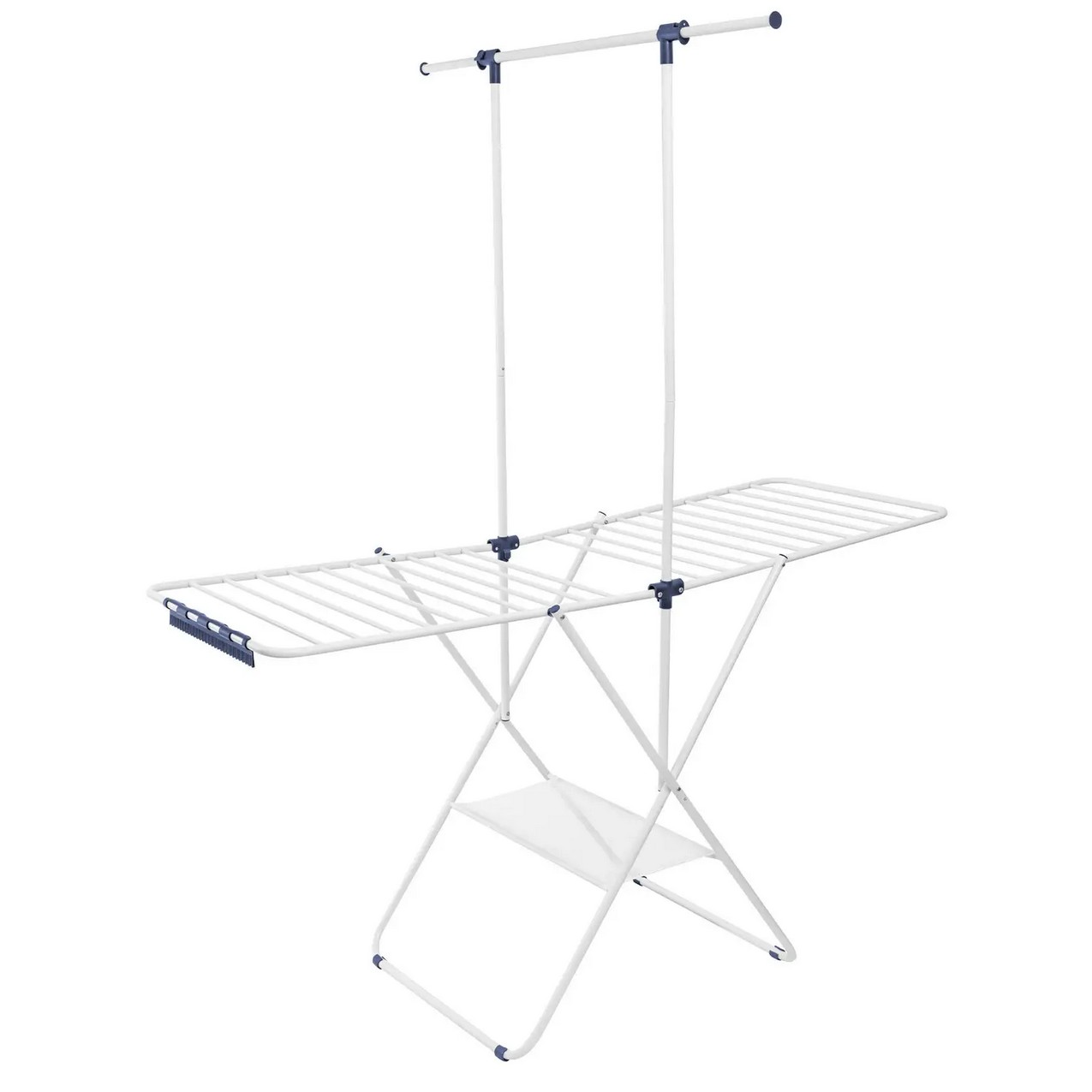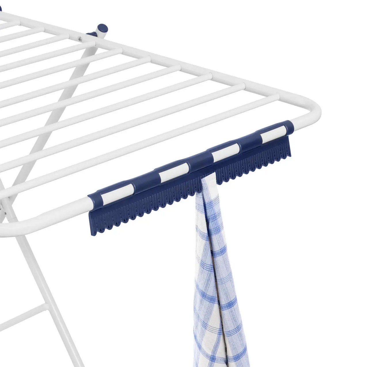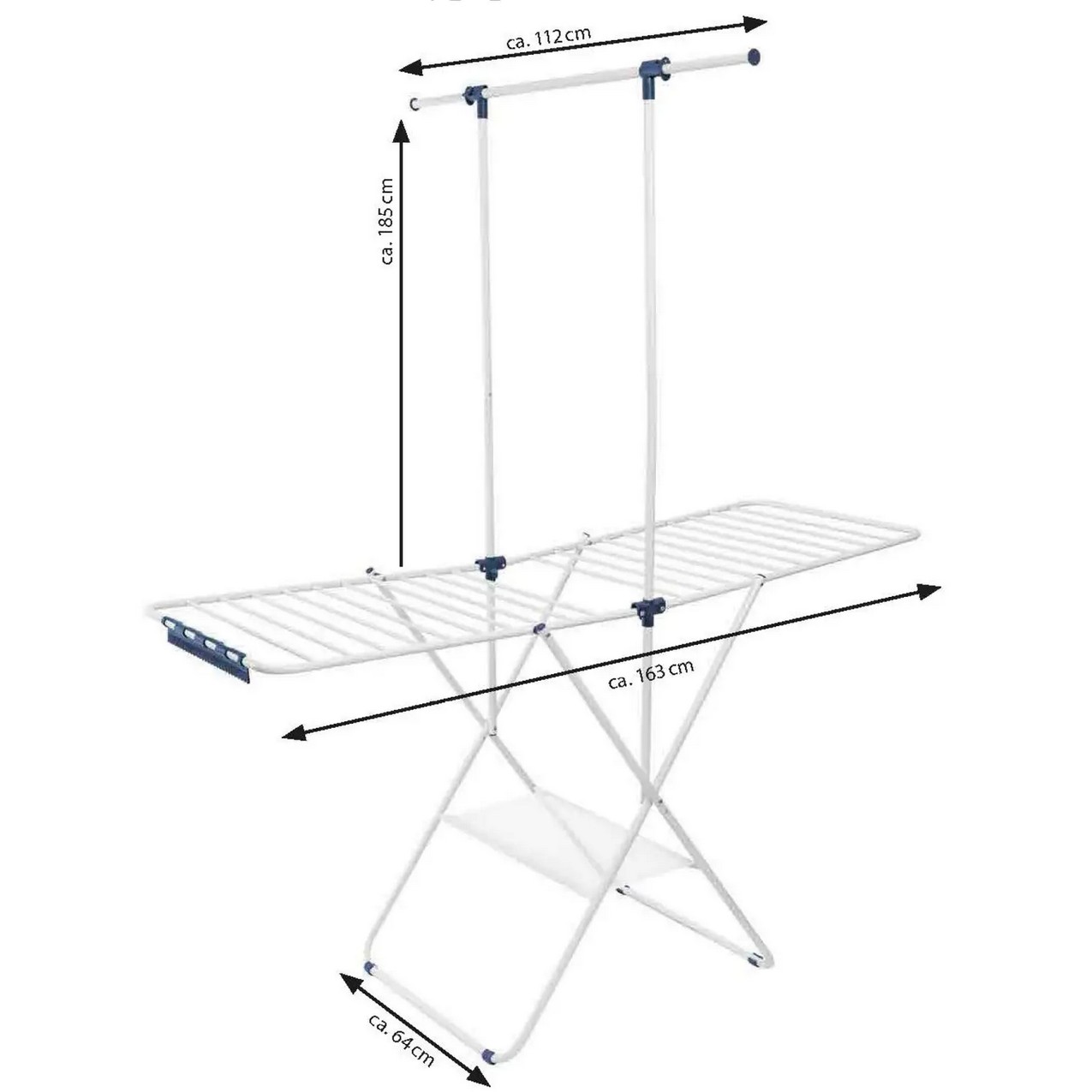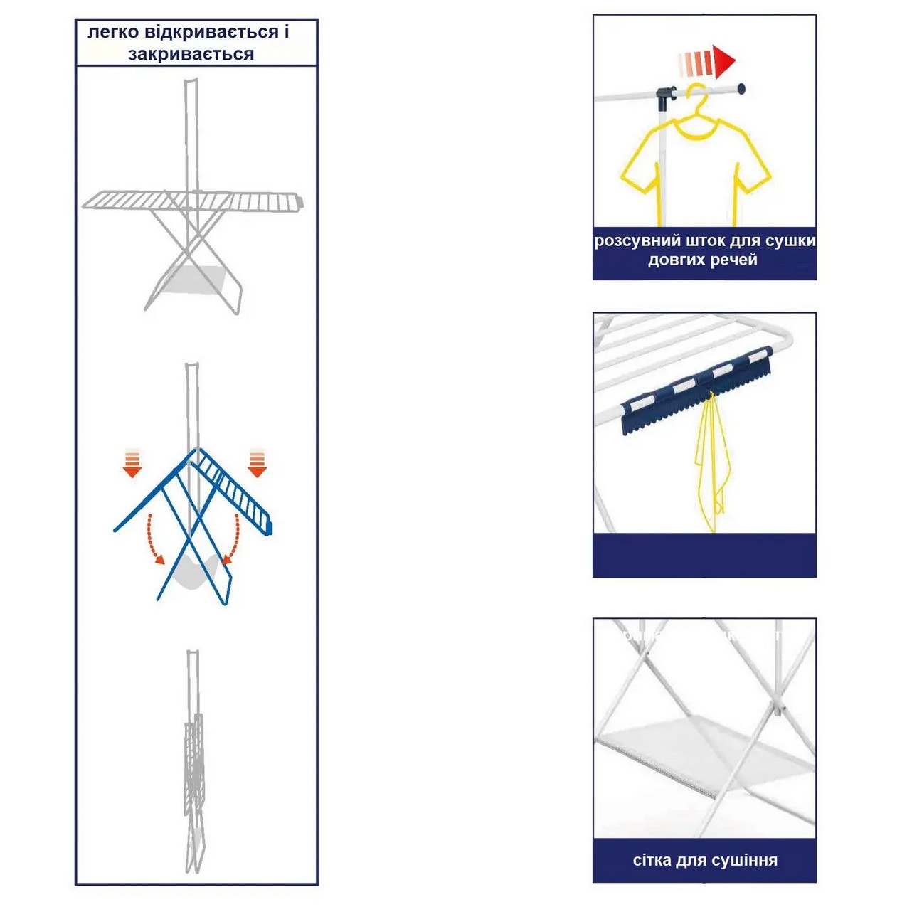 Сушилка имеет рабочую поверхность 12 метров, что более чем достаточно для сушки белья после одного цикла стирки стандартной пятикилограммовой стиральной машинки. Запатентованная конструкция делает процесс складывания-разложения простым и быстрым, а фиксацию ножек – надежной. Это одна из немногих сушилок, имеющая верхнюю перекладину и позволяющую сушить длинные вещи на плечиках. Однако если в верхней перекладине временно нет надобности – ее можно снять вместе со стойками.