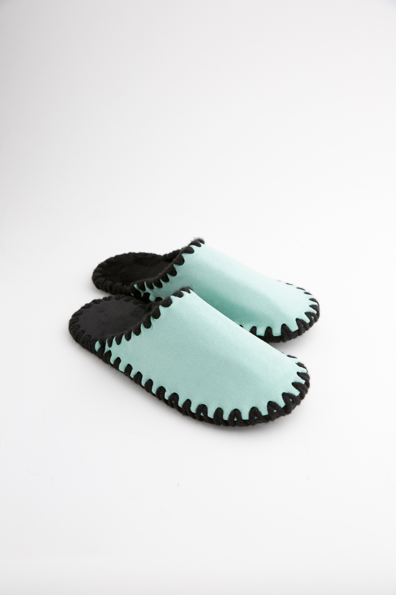 Женские домашние тапочки на основе ментолового цвета с закрытым носком. Данная модель выполнена на ментоловой подошве со специальным антискользящим покрытием, на верхней части – эко-замша, стелька – мягкий велюр. Тапочки очень хорошо переносят многоразовую стирку в стиральной машинке. Очень удобные, невесомые и бесшумные.