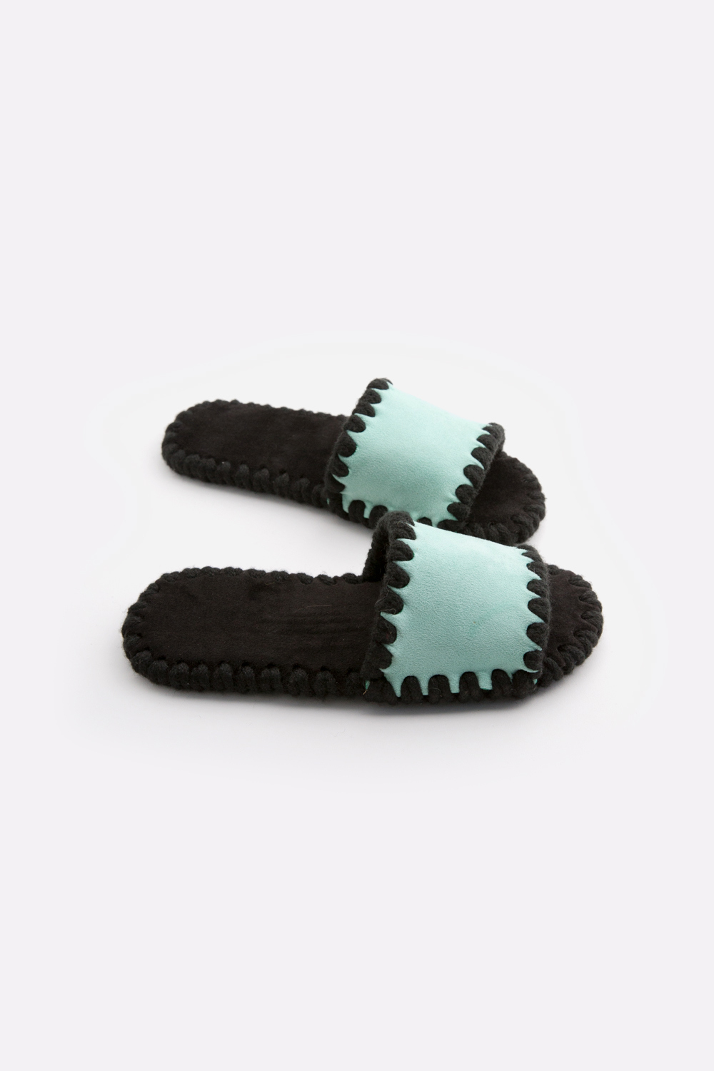 Женские домашние тапочки на основе ментолового цвета с открытым носком. Данная модель выполнена на фетровой подошве со специальным антискользящим покрытием, на верхней части – эко-замша, стелька – мягкий велюр. Тапочки очень хорошо переносят многоразовую стирку в стиральной машинке. Очень удобные, невесомые и бесшумные.