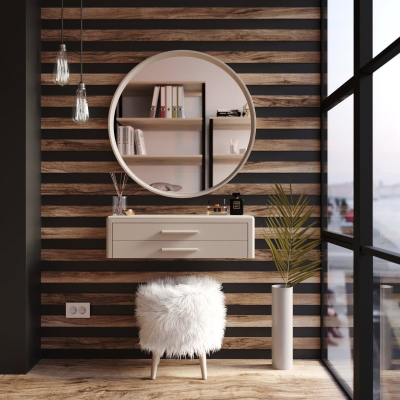 Настенное зеркало “Токио-650” играет ключевую роль в оформлении “территории красоты” и квартиры в целом. Даже маленькое помещение станет просторнее и светлее, а круглая форма рамы из МДФ смягчает строгие формы комнаты.