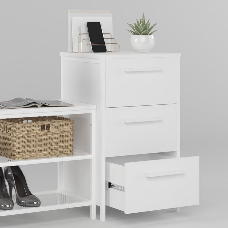 Тумба для обуви Дакара изготовлена из металла и высококачественного ЛДСП. Тумба надежно зафиксирована на металлических ножках, окрашенных порошковой краской. Три вместительных выдвижных ящика предназначены для хранения вещей. Ящики имеют телескопические направляющие (шариковые). Они обеспечивают их плавное и бесшумное открывание.