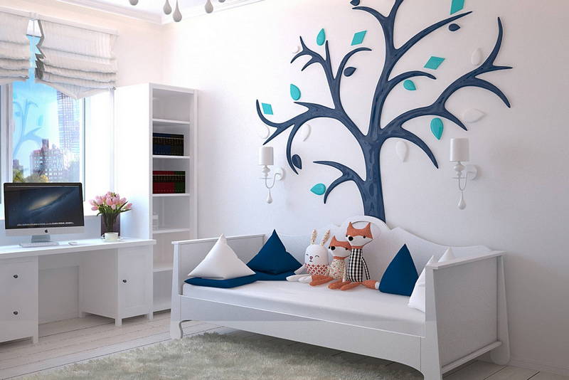 Меблі світлих відтінків здаються невагомими. Для дитячого ліжечка можна використовувати прозорі пастельні кольори – сірий, блакитний, бузковий, персиковий.