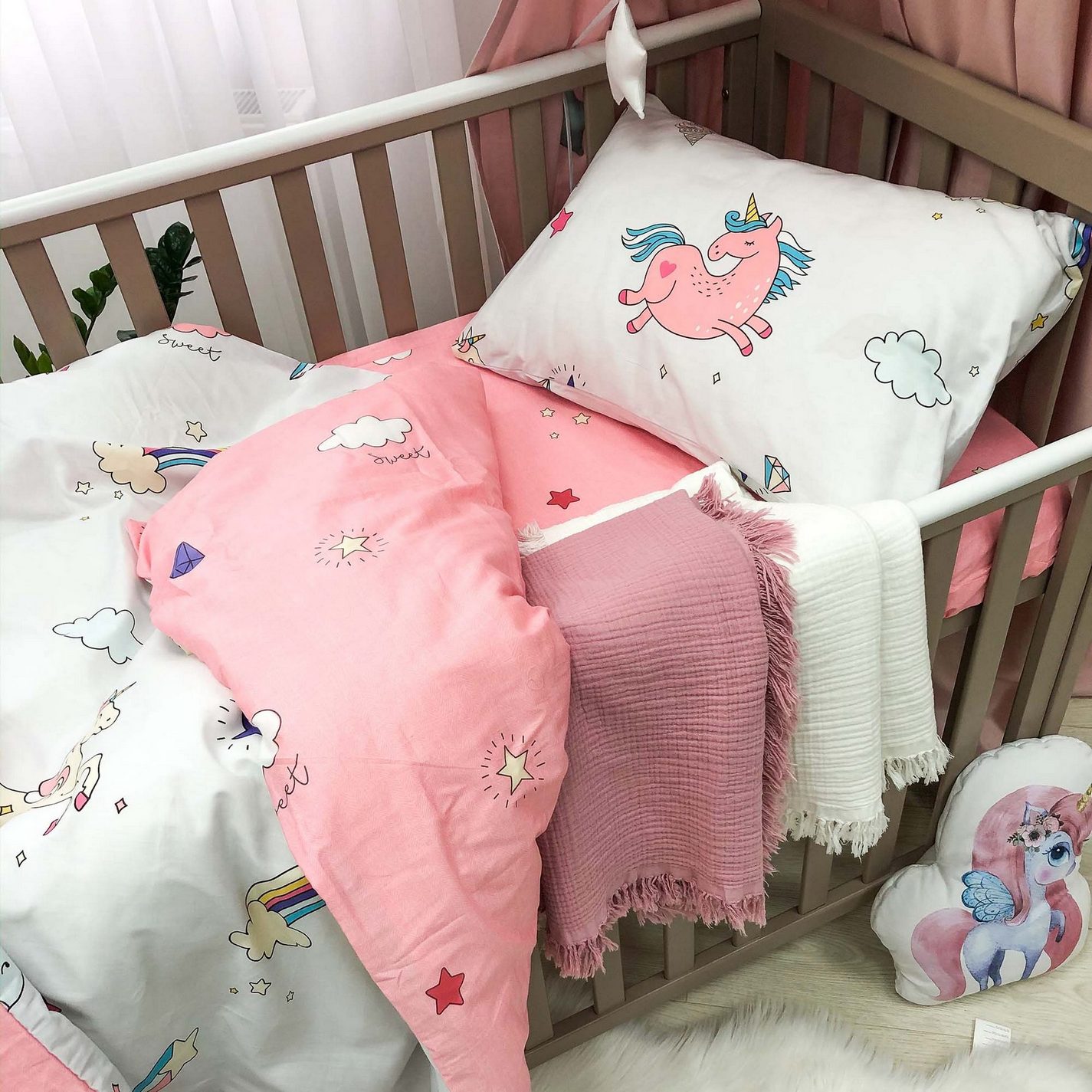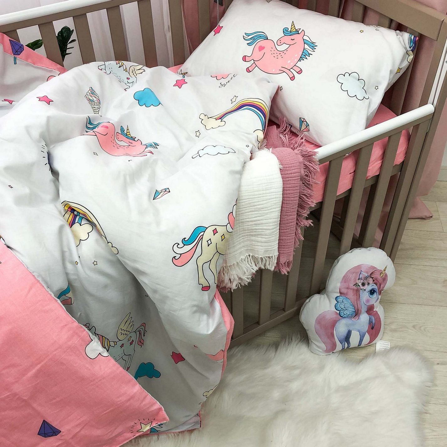 Комплект дитячої постільної білизни Сатин Twill 416 з малюнком єдинорогів та з простирадлом на резинці, завдяки чому білизна не буде сповзати. Комплектація: простирадло на резинці 120x60x10 (см), підковдра 145x105 (см), наволочка 40x60 (см) - 1 шт. Комплект упакований в подарункову коробку, додатково всередині вкладений фірмовий подарунковий пакет. Сатин Twill (Твіл) - натуральна бавовняна тканина, виготовлена з крученої нитки подвійного плетіння, нагадує атлас. Красива, м'яка і шовковиста, приємна на дотик. Тонка, але міцна, з особливим шовковим блиском. Екологічна, має хороші гігієнічні властивості. Тканина складається виключно з натуральної бавовни без домішок, відрізняється відмінною якістю і користується великим попитом у безлічі споживачів за рахунок вдалого поєднання ніжної шовковистості, міцності бавовняних тканин і вартості. Кручена бавовняна нитка подвійного сатинового плетіння, з якої виготовлена тканина, забезпечує щільність, міцність, а також зносостійкість навіть після багаторазового прання. Простіший метод плетіння тканини робить її доступнішою, ніж класичний сатин, але без істотної втрати всіх переваг більш дорогих тканин.