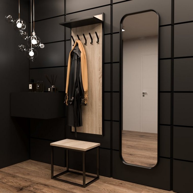 Вішалка в рамі з контрастної ЛДСП, має полицю для аксесуарів і п'ять надійних металевих гачків для верхнього одягу. Гачки пофарбовані. Габаритні розміри вішалки становлять (В/Ш/Г): 1480 × 500 × 236 мм. Банкетка складається з металевого каркасу, пофарбованого спеціальною порошковою фарбою. Сидіння виготовлене з ЛДСП в тон вішалці. Розміри банкетки складають (В/Ш/Г): 436 × 500 × 300 мм. Велике настінне дзеркало є ключовим елементом даного набору. Дзеркало в рамі з фарбованої МДФ. Габаритні розміри (В/Ш/Г): 1610 × 460 × 40 мм.