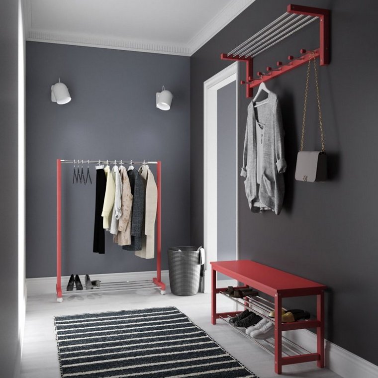 Настінна вішалка з гачками є досить функціональною і ергономічною. Вона складається з дерев'яних планок, зафіксованих металевими кріпленнями, має сім міцних гачків для одягу і полицю для головних уборів. Гачки і полиця виготовлені з хромованих трубок, тому не бояться вологи. Габаритні параметри виробу складають (В/Ш/Г): 320 × 1000 × 250 мм. Велика і містка банкетка (В/Ш/Г): 480 × 1020 × 320 мм дозволить розміститися двом дорослим людям. Сидіння виготовлене з МДФ, шпонованої натуральним деревом. Банкетка має дві місткі полиці для взуття. Стійка для одягу також дерев'яна, має металевий рейл для одягу на плічках, а також додаткову полицю для сумок або взуття внизу. Вішак обладнаний обертовими коліщатами.