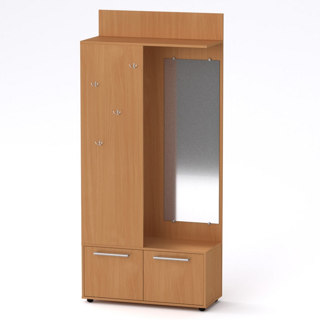 Передпокій володіє компактними розмірами і відмінно підійде для невеликих кімнат. При цьому він акуратно помістить всю верхній одяг і взуття. Передпокій складається з шафи для одягу, зі штангою, полиці для головних уборів, відкритої вішалки з чотирма гачками, а також двох закритих тумб під взуття. На фасаді шафки розташоване широке прямокутне дзеркало, яке можна розташувати зліва або праворуч (за вибором клієнта).