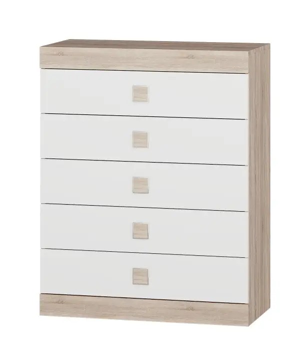 Високий комод Соната-2 з ящиками зроблений із ламінованого ДСП. Він ідеально впишеться в будь-який дизайн кімнати. Модель є частиною модульної системи, з якої можна зібрати гарнітур для вітальні.