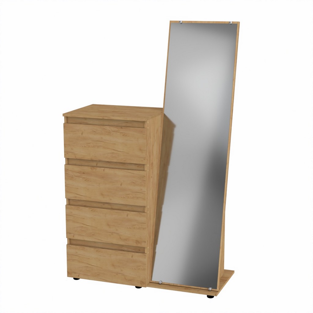 Комод прослужить довгий час, оскільки виконаний з міцного матеріалу - ламінованого ДСП. Комод дуже функціональний,адже він поєднує в собі тумбу-комод і велике прямокутне дзеркало в повний зріст! Тумба складається з чотирьох висувних ящиків, які використовуються для зберігання білизни та інших домашніх речей. Такий комод - ідеальне рішення для спальні, вітальні або передпокою, не займе багато місця!