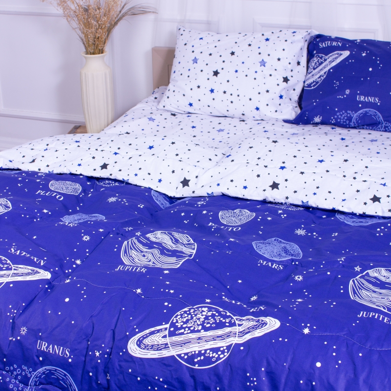 Полуторний 140*205-ковдра - 1шт., 50*70 - наволочки - 2шт, 150*220 простирадло - 1 шт., 50*70 - подушки - 2шт.