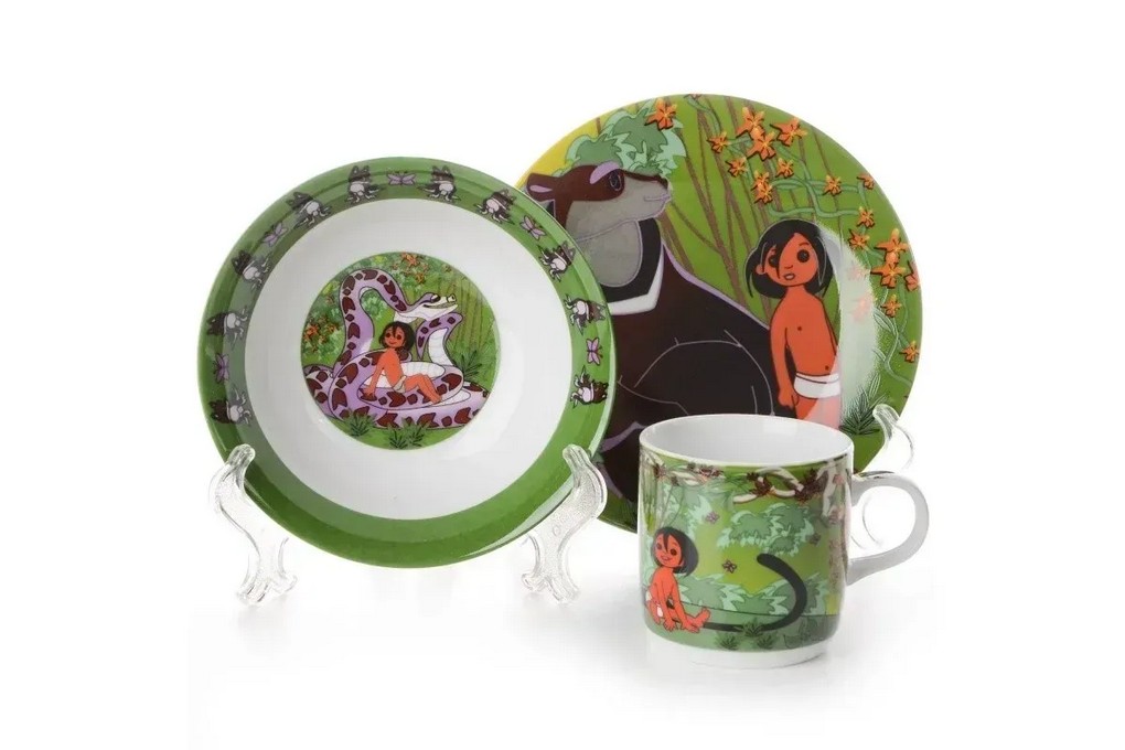 Набір дитячого посуду. Складається з трьох предметів: глибокої тарілки, мілкої тарілки і кухлика. Всім батькам відомо, що у кожного малюка повинен бути власний посуд. Перш за все, це обумовлено правилами гігієни. Однак сьогодні дитячий посуд розробляють таким чином, щоб він був зручним саме для дитячих пальчиків і привабливим саме для дитячих очей. Ми впевнені, що це зробить їжу малюка смачніше, а сніданок, обід або вечерю - цікавіше. Ось чому наша компанія спільно з італійськими партнерами випустила лінію дитячого посуду. Її форма спроектована таким чином, що навіть найменшим діткам буде зручно тримати тарілочку або кухлик. Об'єм розрахований на дитячі порції. На предметах посуду зображені герої мультфільму "Мауглі" за мотивами повісті Редьяда Кіплінга. При виготовленні посуду були використані виключно натуральні і безпечні матеріали. У наборі 3 предмети: тарілка, діаметр - 18 см; миска, діаметр - 15 см; чашка, об'єм - 230 мл.