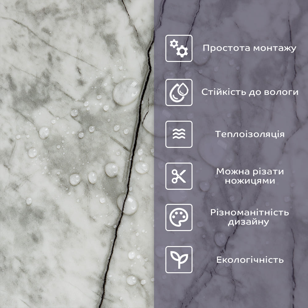 Властивості та переваги матеріалу: 1. Легкість та міцність: плитка легка та міцна, що спрощує її логістику, установку та забезпечує довгий термін служби. Матеріал легкий в установці, можна різати ножицями чи монтажним ножем, не потребує додаткових матеріалів чи спеціалістів. Між смугами не розходиться, не роздмухується і не деформується. Відсоток обрізу становить 1%, що є найкращим показником для настінних покриттів;