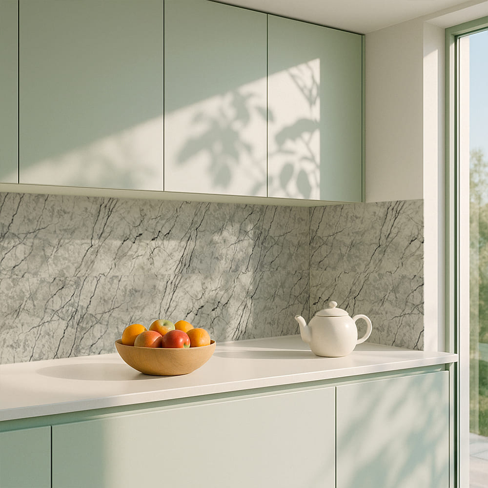 2. Стійкість до вологи: матеріал стійкий до впливу вологи та пари, а також до появи плісняви, що робить його придатним для використання у приміщеннях з високою вологістю, таких як ванни та кухні. Плитка підходить для створення фартуха кухні, можна клеїти біля плити на відстані не менше ніж 20-25 см;