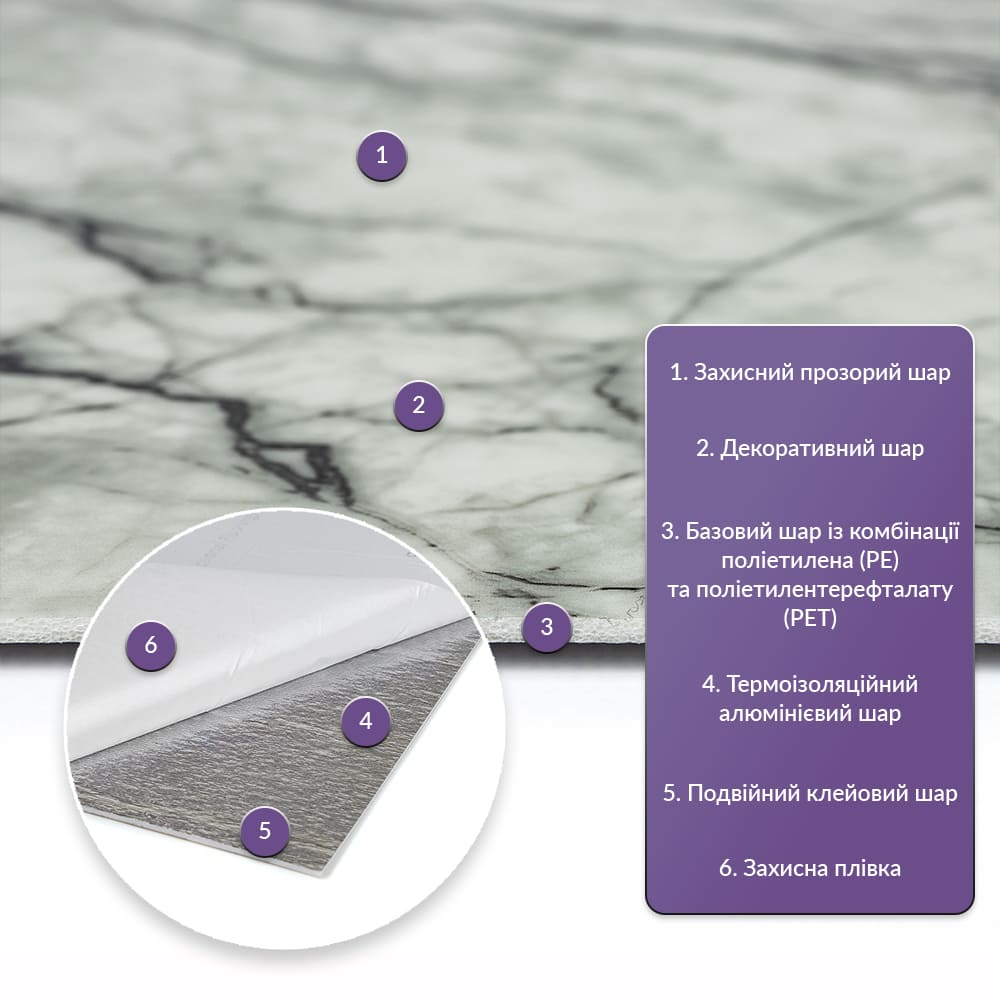 Площа покриття 60 см х 30 см х 2 мм – 0,18 м2, кількість на 1 м2 – 6 одиниць Фактура: рівна