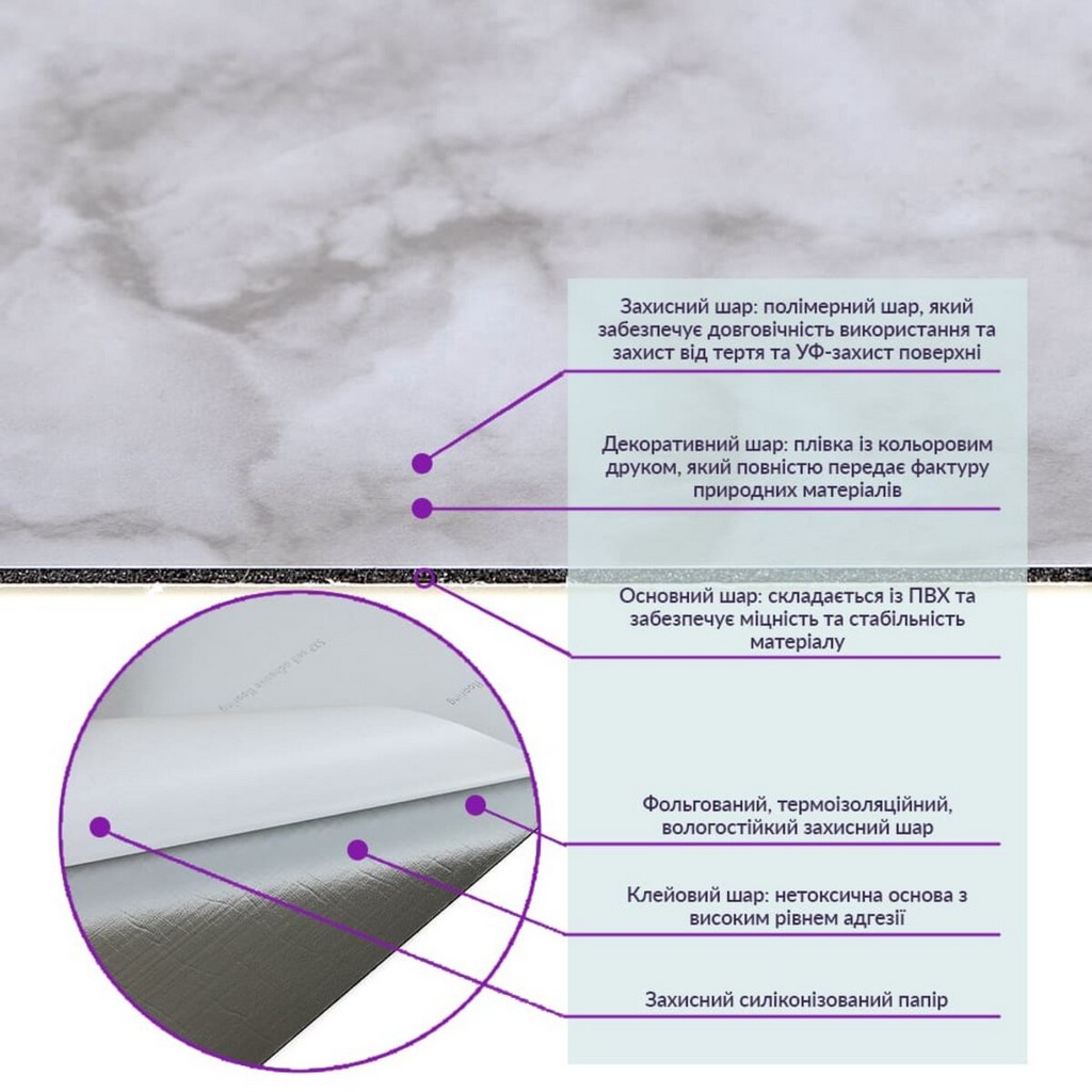 Декоративний шар: плівка з кольоровим друком високої якості, яка повністю імітує фактуру природних матеріалів завдяки чіткому та деталізованому зображенню.