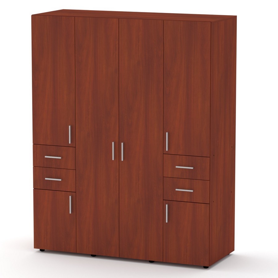 Шафа №20 – це чудова шафа для одягу, в неї зліва і праворуч по дві полиці вгорі і по одній полиці внизу, а також з обох сторін по дві скриньки, в центрі труба для тремпелів, а внизу два ящики. Ручки хром прикрашають дверцята, стоїть шафа на пластмасових ніжках. Великий вибір кольорів дозволить підібрати той, який гармонійно впишеться у Ваш інтер'єр.