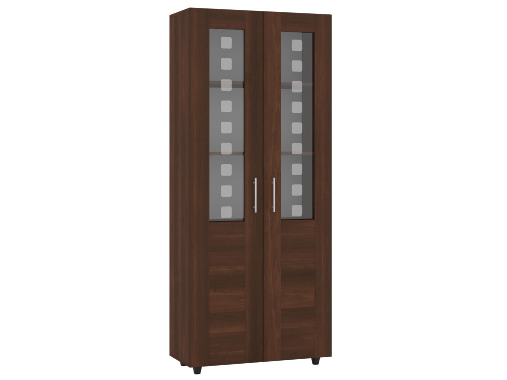 Ця шафа-вітрина поєднує в собі елегантний дизайн і функціональність. Вона виконана в глибокому кольорі, який надає меблям стильний і сучасний вигляд. Дві орні дверцята оснащені скляними вставками з декоративними квадратними елементами, що робить шафу не тільки зручною для зберігання, але й естетично привабливою.