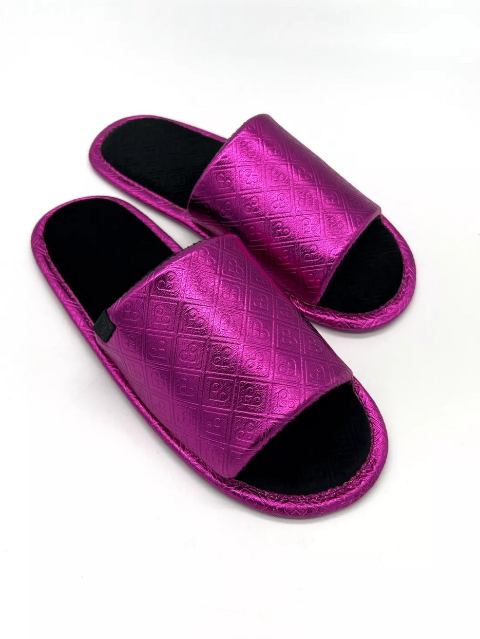 Домашні капці FLEX відкриті з металічним блиском кольору фуксія. У даній моделі підошва виконана на EVA матеріалі, придатного для виходу на двір. Устілка складається з м’якого велюру та memory матеріалу, що запам’ятовує форму ноги. Верхній матеріал еко-шкіра. І верхній матеріал, і устілка забрендовані спеціальним патерном із лого Family Story у вигляді сердечка. Також капчики декоровані залізною защіпкою з логотипом. Ідеально підходять для сезону весна-літо.