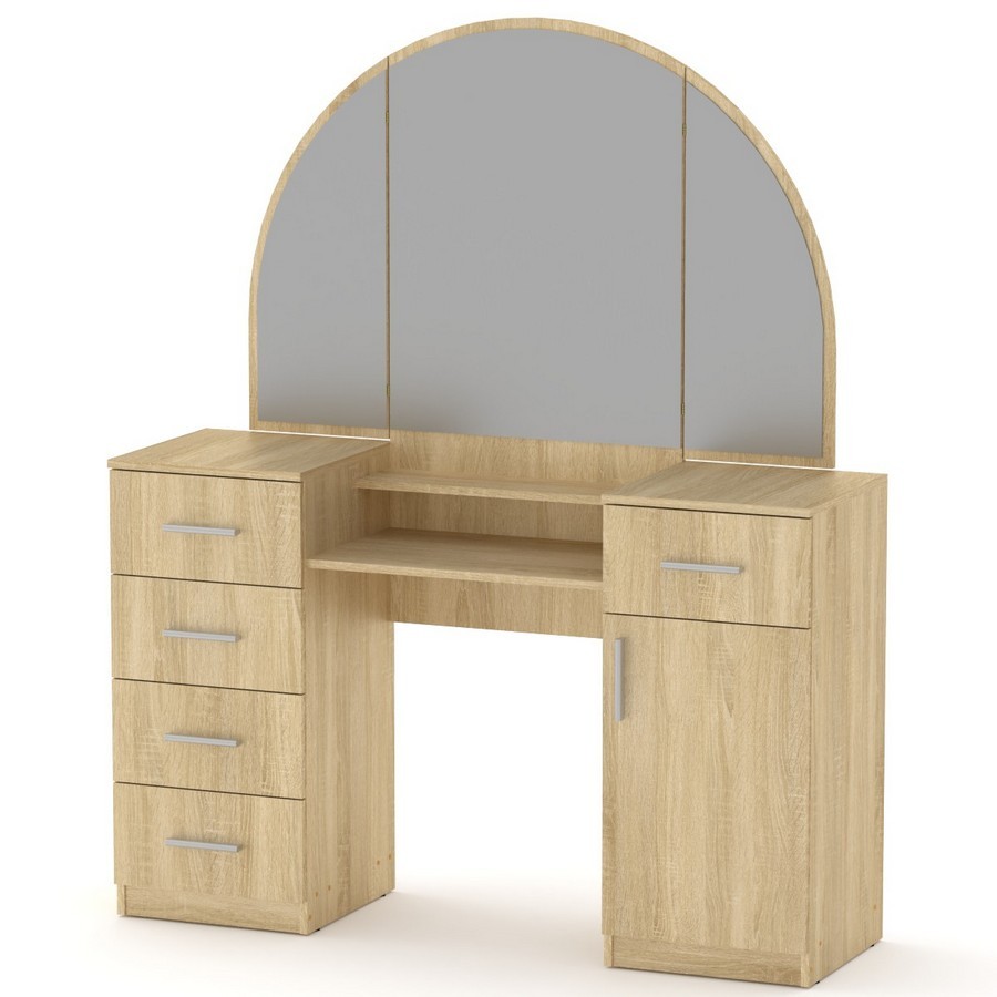 Трюмо №5 від Компаніт складається з тумбочки і п'яти висувних ящиків. Гарне дзеркало, має форму півкола та двох орних дзеркальних панелей. Дана модель відмінно підійде для класичного або сучасного дизайну. Проста конструкція, якісна фурнітура та стриманий стиль.